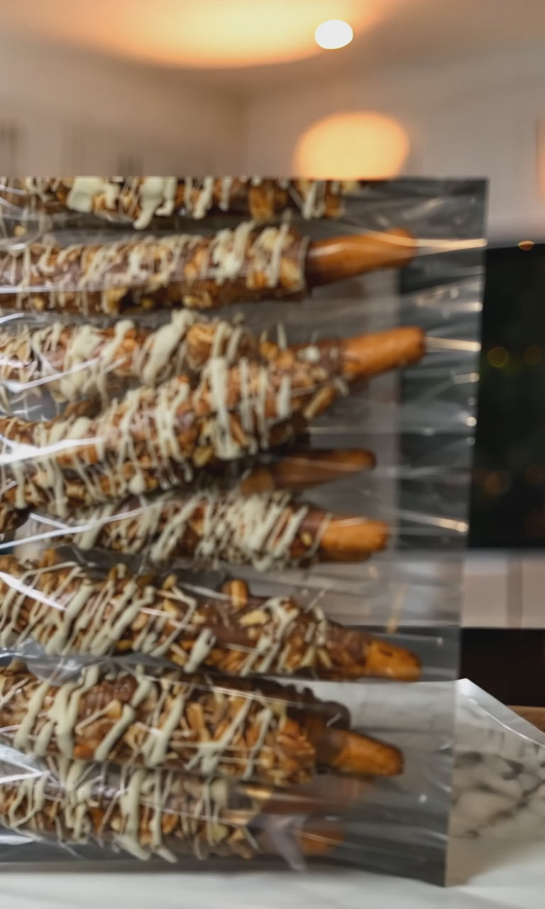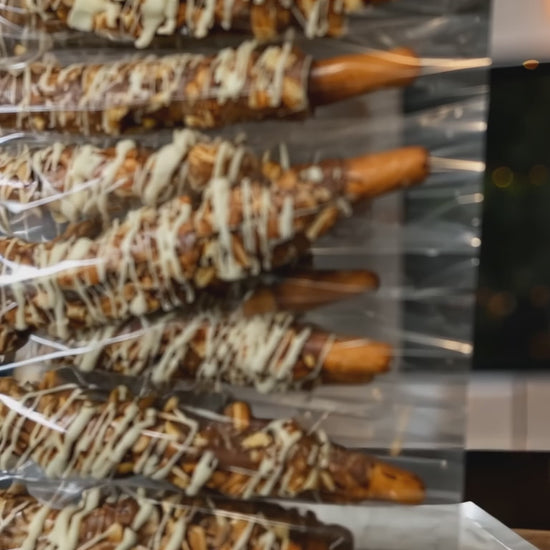 A crunchy, nutty twist on a classic treat. Pecans, Caramel, and Chocolate wrapped around a pretzel stick.